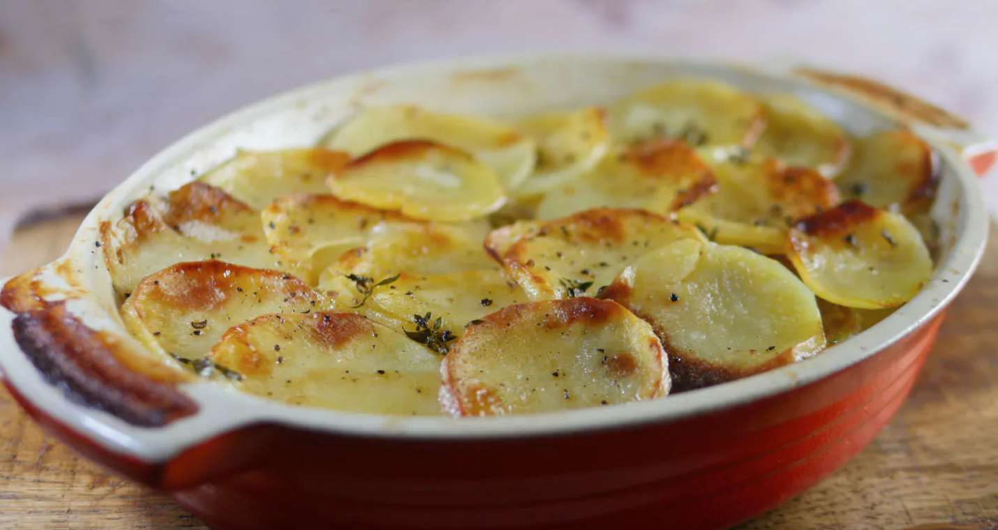 Slow cooked potatoes with chicken stock, herbs and garlic and no cream. A healthier alternative to Dauphinoise and perfect with the Dijon chicken.