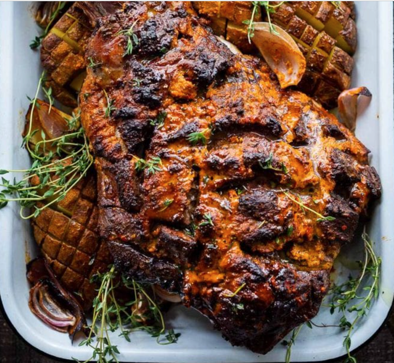 Marinaded for 24 hours in a spice mix rich with rose harissa, honey, cumin and garlic. Then braised until tender and juicy and roasted at the end. Topped with pomegranate seeds and sauce to mop up.