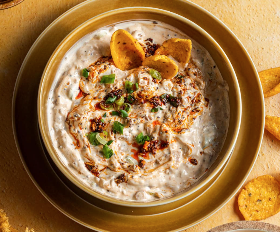 A great way to kick off with this fun and festive spicy sour cream dip. It's combined with caramelised onions and garlic, then topped with a crunchy tadka (spiced oil) laced with cumin seeds, mustard seeds and chilli powder.